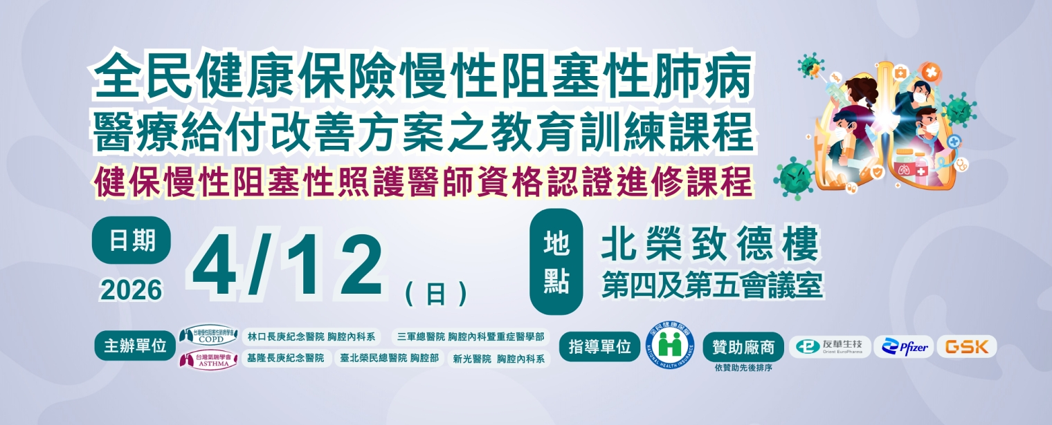 2026/9/12-9/13【115年慢性阻塞性肺病專科醫師核心教育課程】- 凡取得慢性阻塞病專科醫師,即具備參與全民健康保險「慢性阻塞性肺病」療給付改善方案(P4P)申請資格,且無需上基礎課程-籌備中
