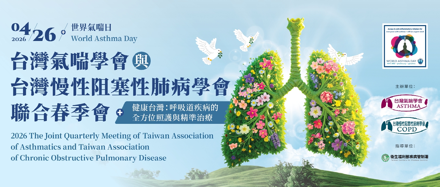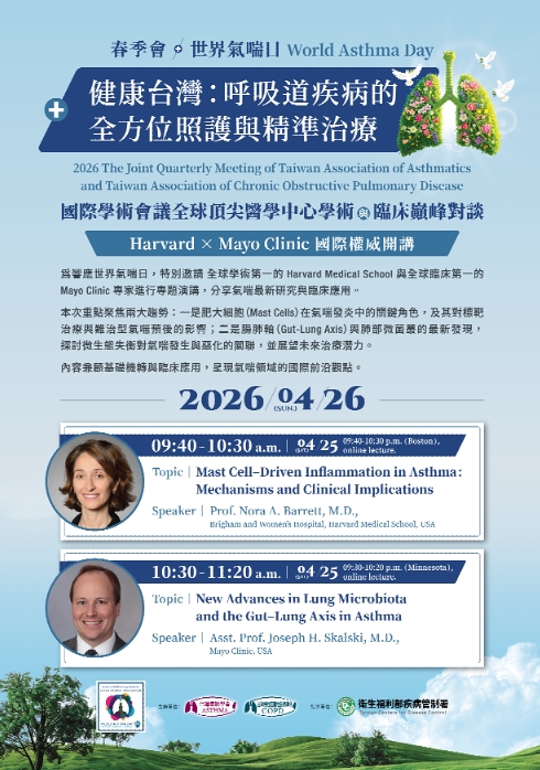 【2026/4/26】-台灣氣喘學會與台灣慢性阻塞性肺病學會聯合春季會-特別邀請 全球學術第一的Harvard Medical School 與 全球臨床第一的Mayo Clinic 教授專家進行專題演講,分享氣喘最新研究與臨床應用。