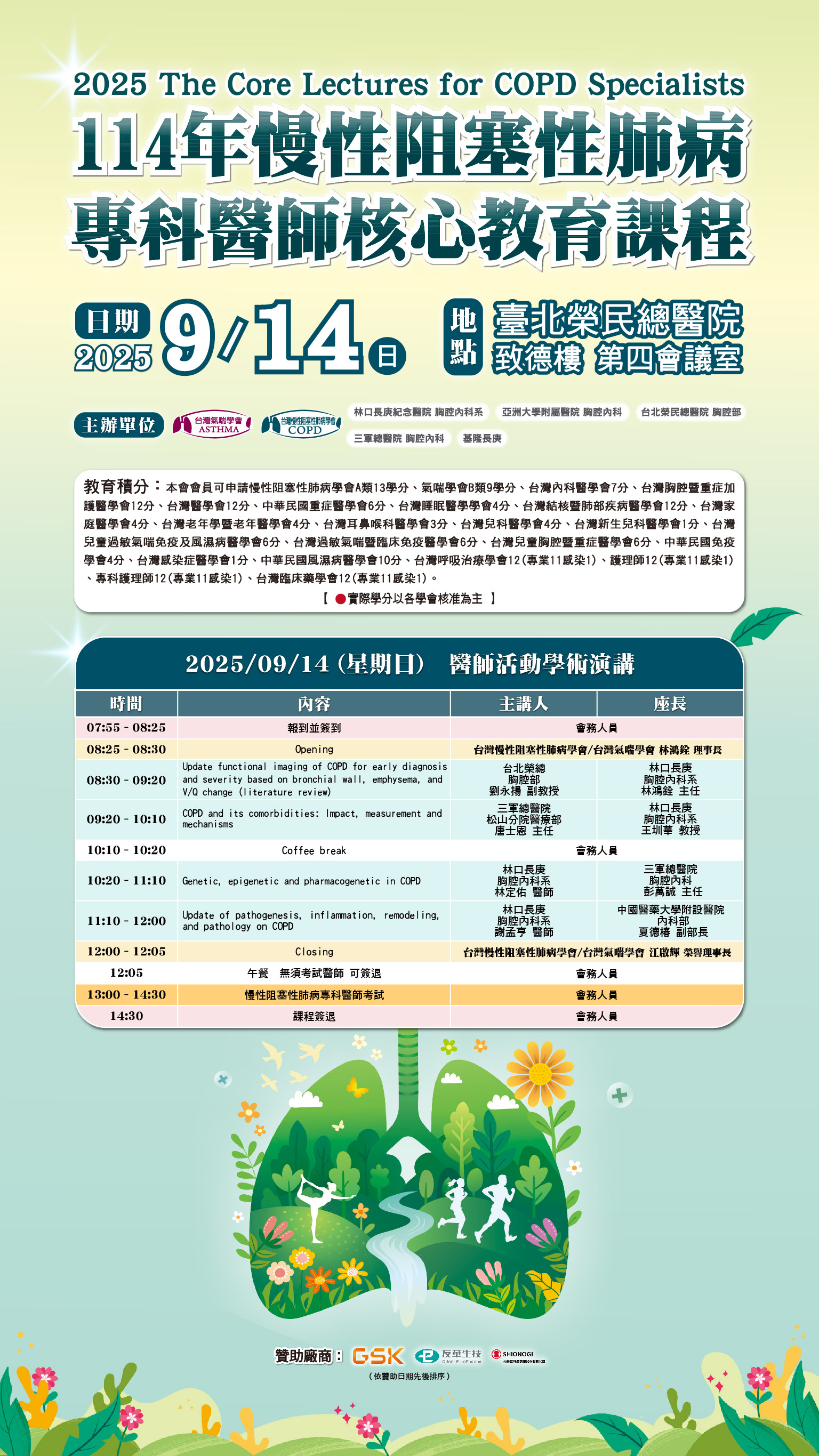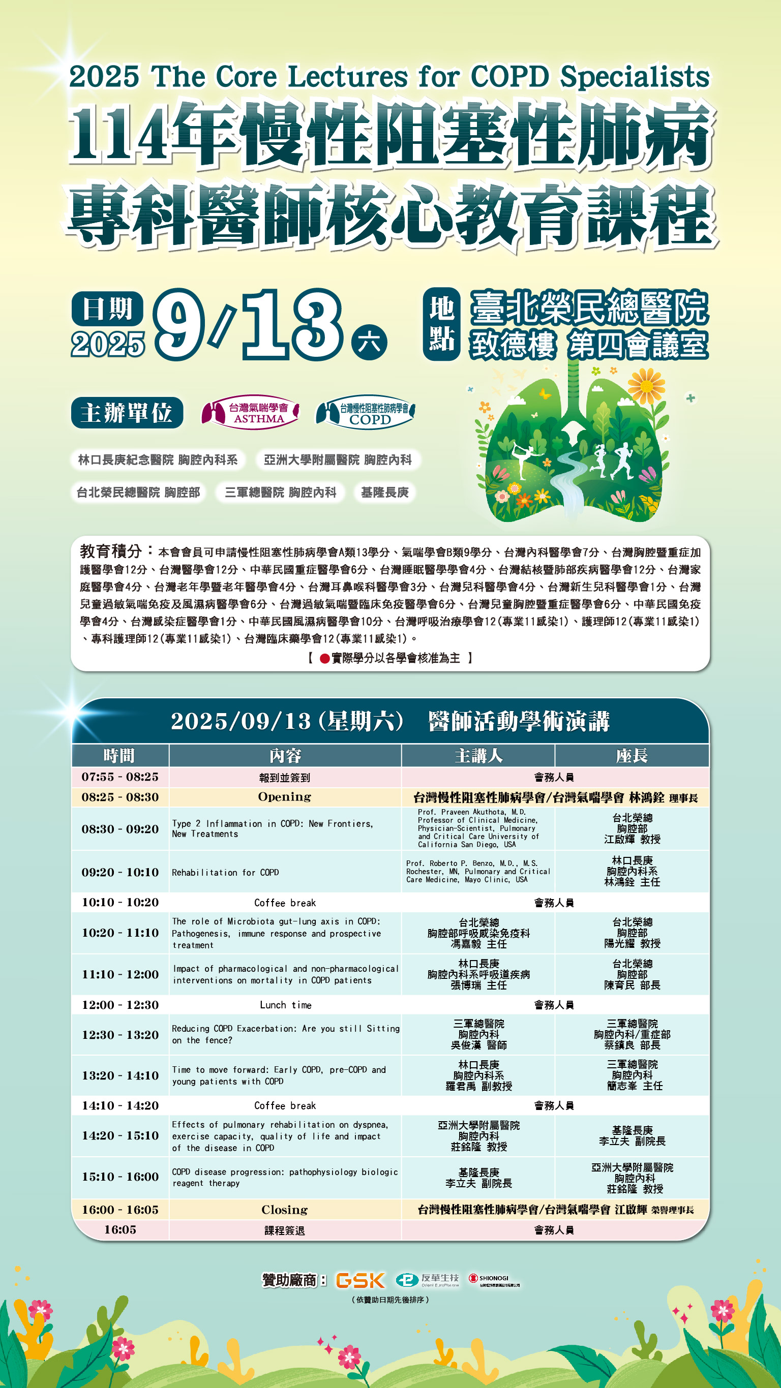 [2025/9/13] 2025/9/13-9/14【114年慢性阻塞性肺病專科醫師核心教育課程】邀請美國知名Mayo Clinic 的教授專題演講【課程內容詳見下方摘要說明】-歡迎踴躍報名或電洽0928175728秘書處 |